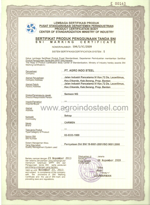 Pada tanggal 24 November 2009, PT. Agro Indo Steel meraihkan sertifikat produk penggunaan tanda SNI dari Lembaga Sertifikasi Produk Pusat Standardisasi Departemen Perindustrian untuk merek sekop terpercaya kami yang bernama CARMEN®.
